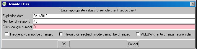 An expiration date is REQUIRED. The client dongle number must be known (but is remembered once you enter it). Checking the "Frequency cannot be changed" or "Reward or feedback mode cannot be changed" checkboxes means that the remote client cannot alter the session-plan setup values. If the "ALLOW user to change session plan" options is checked, the remote user will be allowed to alter the session plan at the remote computer (and have it used).