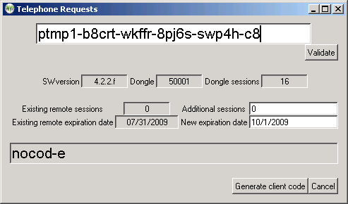 The therapist enters the code from the remote client in the top box. When the entered code is valid (no transposed digits, etc.), the "Validate" button will become active. Pressing that button decodes the data from the user showing how many remote sessions are remaining and the remote session expiration date. Also, the dongle number, number of dongle sessions, and the client software version is displayed. Assuming the data was really valid, the clinician can now enter additional remote sessions and/or and extended expiration date. Clicking on "Generate client code" causes a reply code to be generated (the above sample shows "nocode" right now). The 26-character code must be read back to the remote client for entry into the client's request screen.