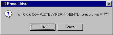 CAUTION: this process really DOES completely and permanently erase the contents of the drive. If you say Cancel, you get a message like this: