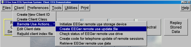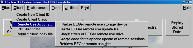 Selecting the "Retrieve EEGer remote use data" option will allow selection of the remote device and retrieval of any data on the device just as is automatically done when a new remote device initialization is done (as described above).