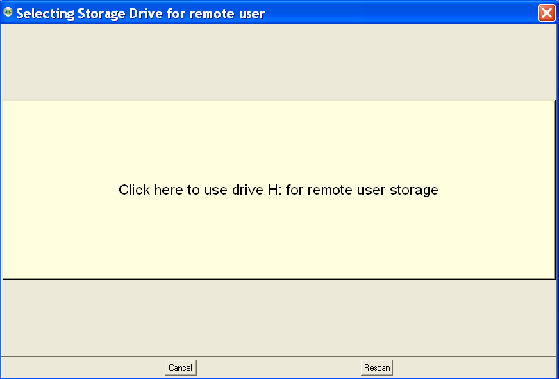 Notice that the H: drive (in this example) contains a suitable device. Also, notice the rescan button which performs another scan (in case you forgot to plug in the USB storage device). A drive is selected by clicking on it.
