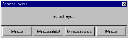 Layouts control the session plan and real-time brainwave screen display and processing actions. The "5-trace" layout is the same layout as EEGer 4.0 used. The "6-trace,inhibit" layout adds a second (low) inhibit processing display/control. This layout specifies that any of the three inhibit streams can inhibit rewards. The "6-trace,reward" layout adds a second reward stream. In this mode, BOTH reward streams must be in a reward state for a score to be given. The "8-trace" mode has two sets of reward+2 inhibits, each driven by a different input stream. Again, BOTH rewards must be in a reward state for a score to be given. There are separate session plans for each layout.