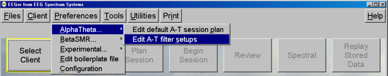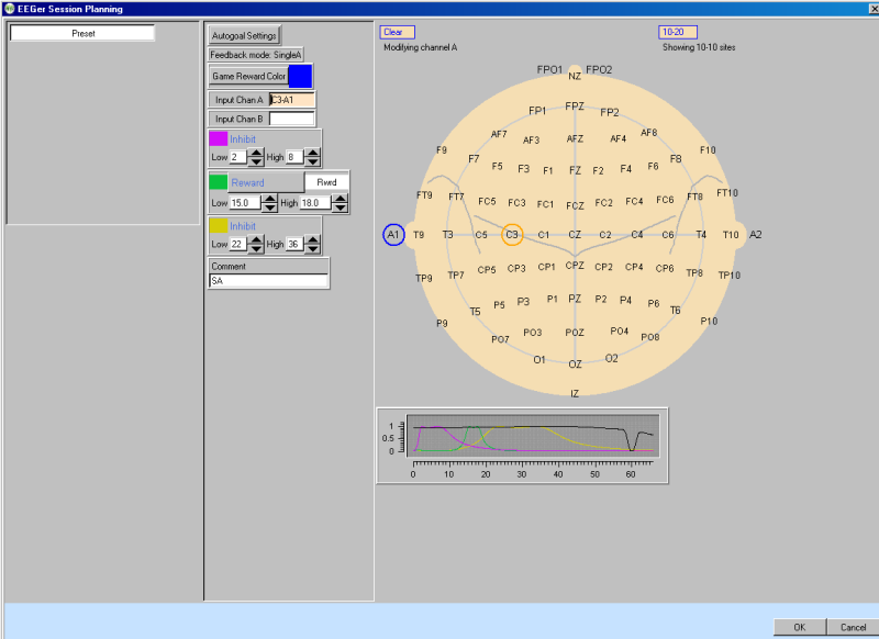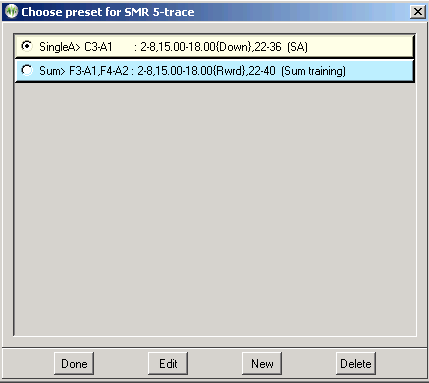 The session planning screen (limited to one stage; notice the stage is labeled "Preset") allows creation of a set of filter frequencies, sites, and modes which are selectable from a normal session planning screen.