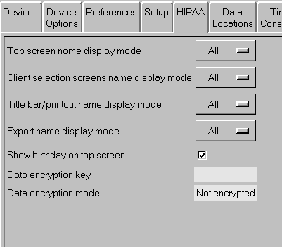 The HIPAA tab contains options used to obfuscate the client name. The options make NO alterations to the client ID which is used to identify files, etc. The display mode options are :