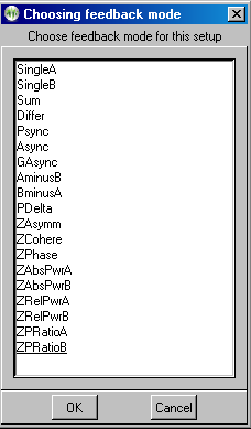 Clicking on the Feedback Mode button (top center) pops up a menu of choices for (starting) feedback modes showing all the possibilities. It is possible to select a mode at the planning stage (now) that there is no license for. At actual feedback time, any unlicensed condition will cause SingleA (single channel, A input) to be selected. Of course, you can change the feedback mode (using F3) during the actual feedback process.