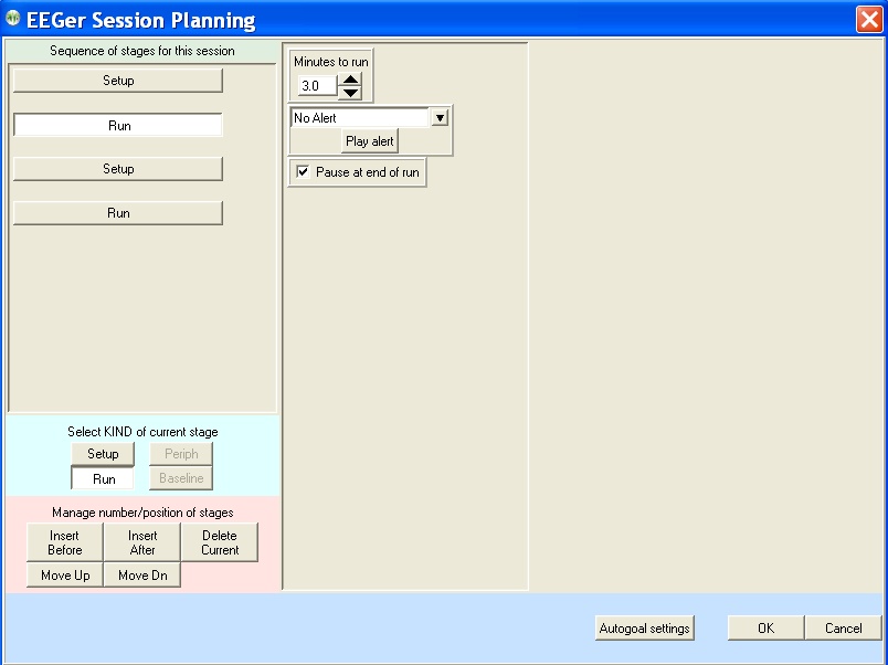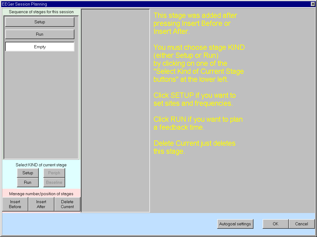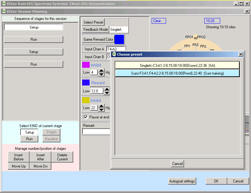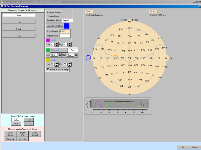 Every session requires a "session plan". This is the time/place that initial site locations, frequencies, feedback modes, and autogoal selections are made. Most of these selections are changeable during a session but an initial plan is required. There is a separate session plan for each layout. A session plan is comprised of a number of "stages". Each stage is a particular action/operation such as electrode placement, providing feedback, etc. In this version of EEGer, there are two kinds of "stages": Setup stages (electrode placement, frequency/mode establishment) and Run stages (actual feedback for a planned time). A plan is saved for each client/protocol class/layout combination (Each client has a session plan for each protocol class created using the Create client class option). Clicking on the Plan Session button brings up the following screen: