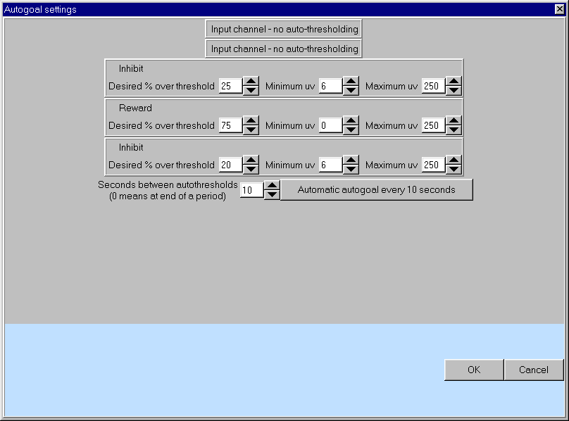 Any stream with 0 % selected will have NO change made when F11 is pressed. The Minimum uv value is the minimum (measured average value) threshold that will ever be "automatically" set by F11. The Maximum uv value is the largest threshold value that will be set by F11. The Autogoal only on F11 button is a toggle where the other value is Automatic autogoal every rest period or Automatic autogoal every xx seconds where xx is the number of seconds in the entry box. Clicking on OK saves the autogoal settings and returns to the session planning screen. When the F2 key is used during real-time processing to switch between up and down rewarding, the appropriate percentages would be reversed (i.e. 65% would become 35%).
