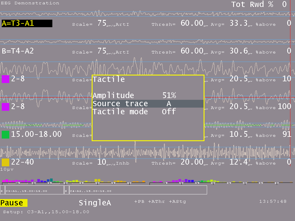 Any trace can be selected as the source of tactile data. The tactile mode can be OFF, 10 Hz, 60 Hz, or 160 Hz. This is the frequency of the signal being modulated by the source trace amplitude. Note that many laptops cannot produce 10 Hz signals due to poor audio systems.