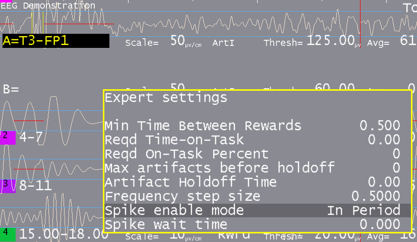 - "Spike enable mode" allows changing the spike detector mode. Any mode except 'Disabled' causes (yellow) vertical bars to be shown on the raw traces. If mode is "In Period" or "Always", an optional sound can e produced on the game computer.