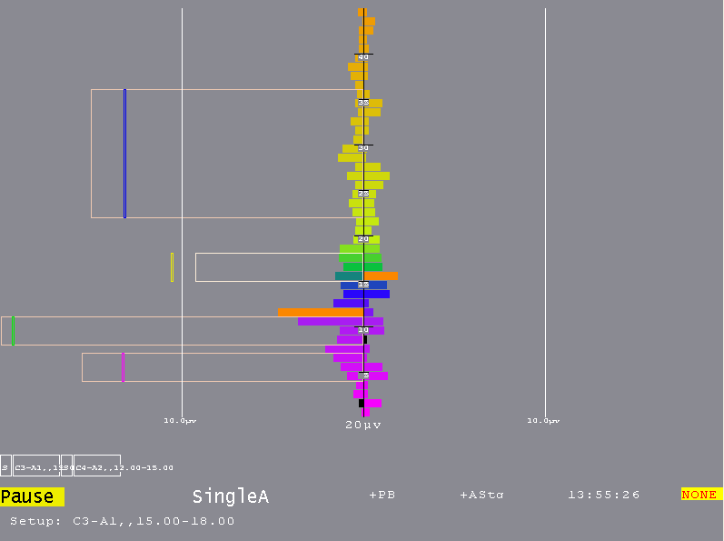 Notice that the filter bands are shown with a threshold value as the edge of the outline and the current average amplitude is shown as a vertical colored bar at the appropriate position. The orange bars are the dominant frequency markers.