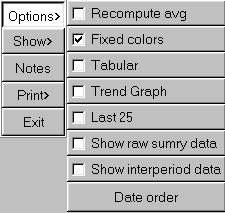 The bottom graph is a trend graph of sessions. The colors of the lines are the frequency-specific colors used throughout EEGer. To the right of the trend graph is a list of all the sites used in the displayed sessions. To the right of the list is a scale slider allowing selection of a voltage scale for the trend graph (or 0 for autoscaling). At the right edge are some buttons and checkboxes allowing various options. The options available are shown here: