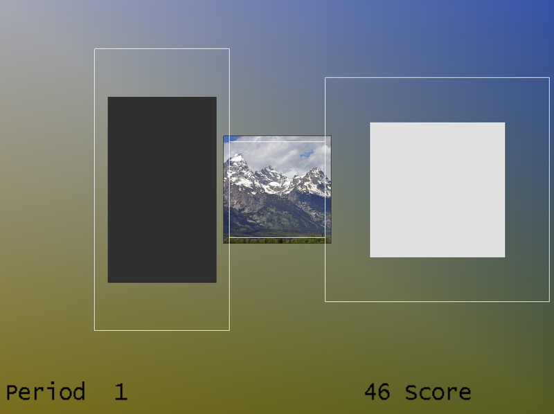 The colors of the boxes in classic mode are consistent in this and several other games. The low frequency box at the left is magenta; the high frequency box at the right is yellow, and the center box is blue for SMR training and green for beta training (as controlled by the therapist). In the modern mode, the box colors are fixed and the entire background is set based on the current image being displayed in the center box. The image changes at the end of each period.