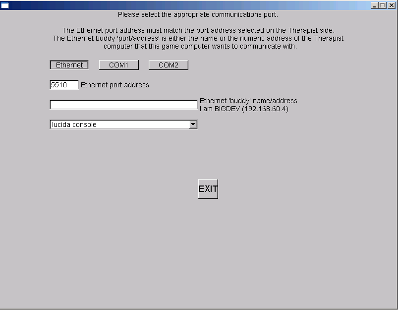 On this menu, the appropriate Ethernet port address (which MUST match the therapist preference setting) can be set.